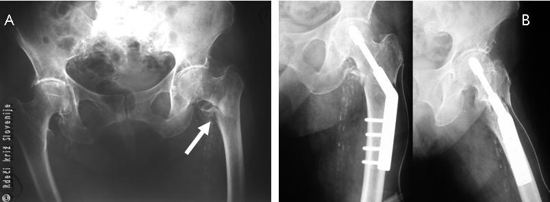A, B – RTG slika zloma zgornjega dela stegnenice in RTG sliki po osteosintezi.