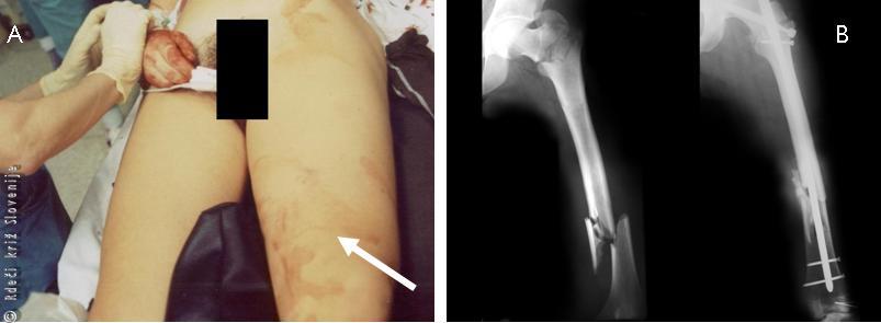 A – Izgled zadebeljenega stega po zlomu stegnenice.