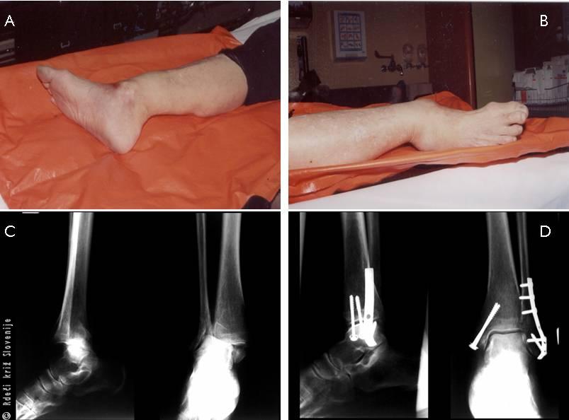 C, D – RTG slike zloma gležnja pred in po operaciji.