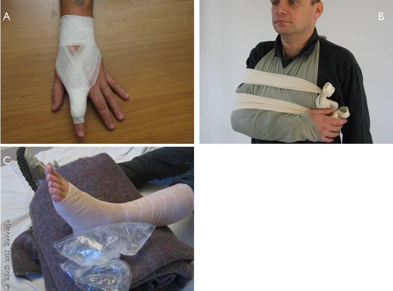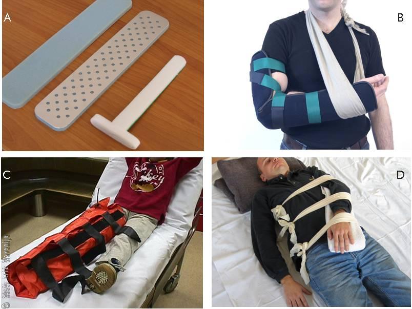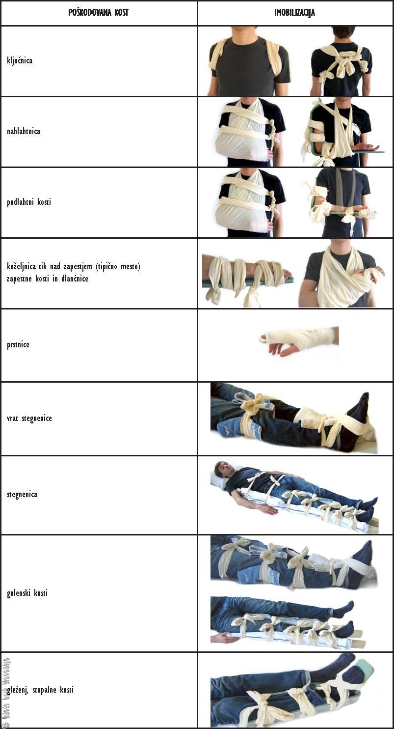 Imobilizacija: S pomočjo obvezovalnih materialov učvrstimo poškodovane dele telesa ob trup, zdrav ud ali na opornice v najugodnejšem položaju. Omogočimo tudi dvigovanje in nošenje poškodovanega uda (Slika 1B).