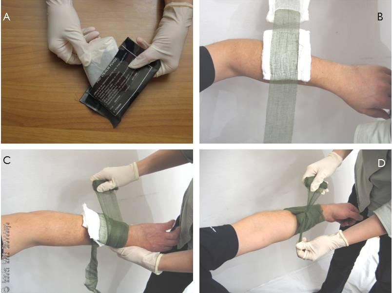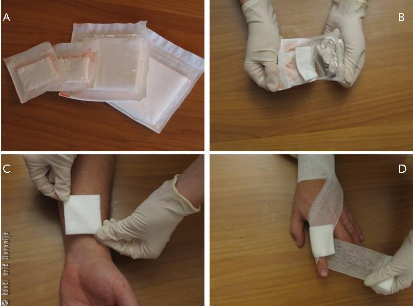Prvi povoj je spravljen v sterilnem ovoju, ki ga odpremo tik pred uporabo (Slika 7A). Ko je povoj odprt, primemo z obema rokama glavi povoja in ga raztegnemo (Slika 7B). Sterilno gazo položimo preko rane. S krajšim koncem povoja (manjša glava) napravimo zavoj, s čimer gazo zasilno pritrdimo, preostanek krajšega konca pa pustimo viseti. Nato nadaljujemo povijanje z daljšim koncem povoja in na koncu zavežemo oba konca povoja (Slika 7C, D).