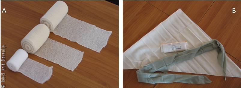 V vsako torbico prve pomoči, tako laične kakor tudi bolj strokovne, spadajo trikotne rute, povoji in sterilne gaze oziroma njeni sodobni nadomestki.