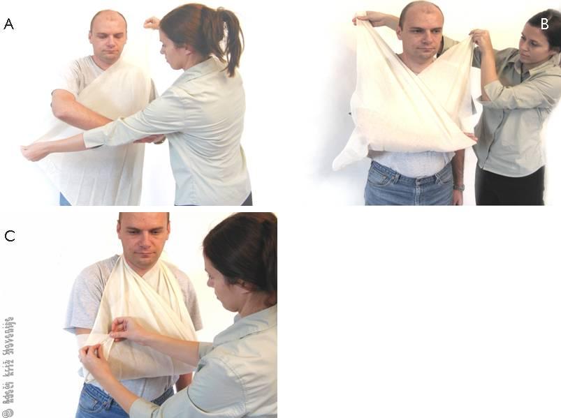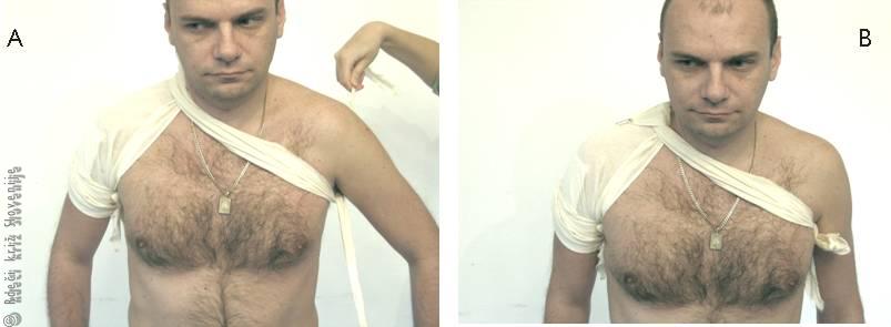 Enak postopek velja za obvezovanje komolca, ramenskega sklepa in kolka, le da pri rami in kolku krajca zavežemo pod ramo oziroma kolkom, prosti vrh pa ob telo pričvrstimo z dodatno, ozko zloženo ruto (Slika 17A, B).