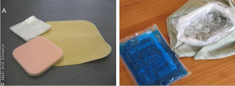 V to skupino lahko uvrstimo hladne obkladke, vrečke ledu in specialne hladilne vrečke, polnjene z gelom (Slika 5B). Hlajenje poškodbe je poleg privzdigovanja in povijanja poškodovanega dela telesa najpomembnejše, kar lahko storimo za omejitev otekanja in bolečine. Pri hlajenju z mrzlimi obkladki je potrebno obkladek namočiti v mrzli vodi vsakih 3–5 minut, da ostane hladen. Poškodbo hladimo vsaj 20 minut. Pri hlajenju z ledom oz. ledenimi hladilnimi vrečkami je pomembno, da zaradi možnega nastanka ozeblin preprečimo neposreden stik ledu s kožo, najbolje tako, da led zavijemo v tkanino ali damo v lonček. Poškodbo hladimo 10–15 minut oziroma do nastanka rdečine. Hlajenje lahko ponavljamo na 2–3 ure.