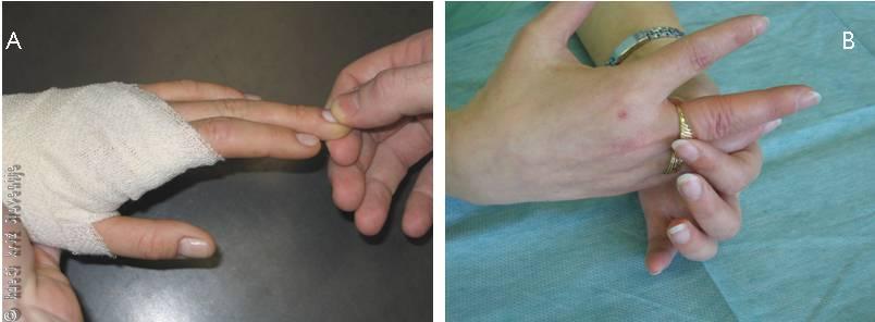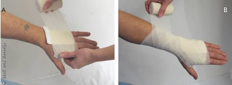 Pričnemo s krožnim zavojem prek prstov (Slika 9A), nadaljujemo z osmicami, ki se križajo preko zapestja (Slika 9B). Obvezo končamo s krožnim zavojem nad zapestjem.