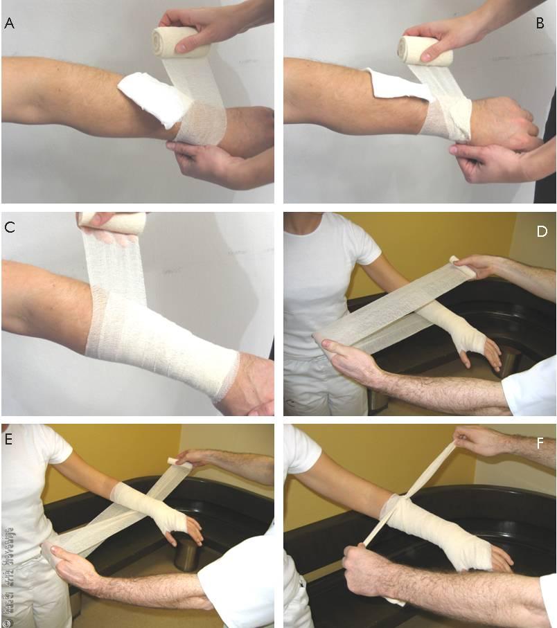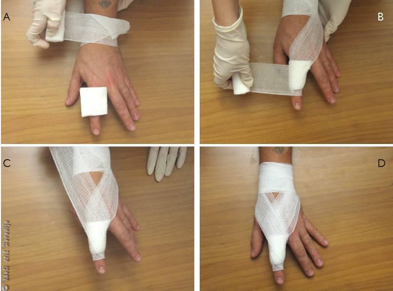 Pričnemo s krožnim zavojem prek zapestja (Slika 10A), nadaljujemo z vijakastimi zavoji prek prsta (Slika 10B) ter z osmicami, ki se križajo na hrbtišču dlani (Slika 10C). Končamo s krožnim zavojem nad zapestjem (Slika 10D).