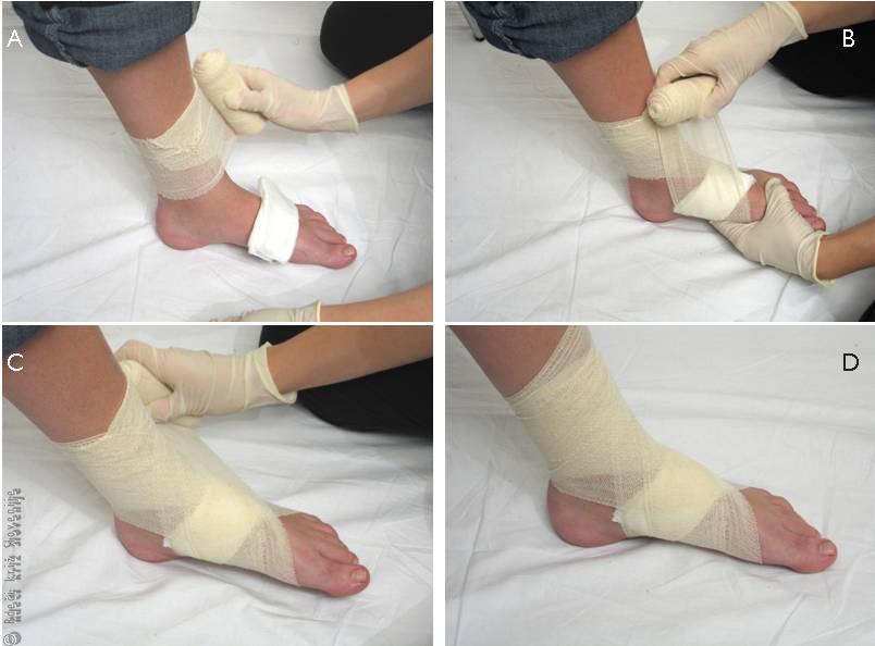 Pričnemo s krožnim zavojem nad gležnjem (Slika 11A), nadaljujemo z osmicami preko stopala in goleni, ki se križajo na nartu (Slika 11B, C). Končamo s krožnim zavojem nad gležnjem (Slika 11D).