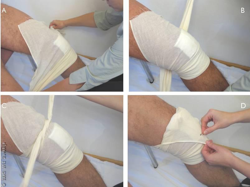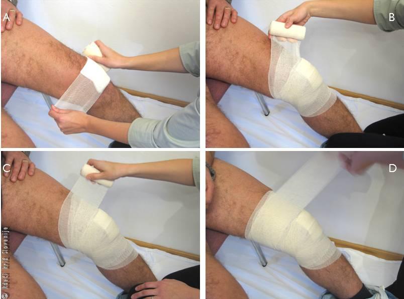 Pričnemo s krožnim zavojem prek pogačice (Slika 12A), nato nadaljujemo z osmicami, ki se križajo na upogibni strani sklepa (slika 12B, C). Obvezo končamo nad sklepom (Slika 12D). Podobno povijamo tudi komolec.
