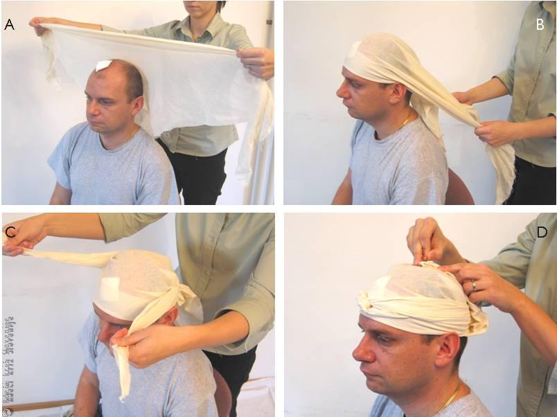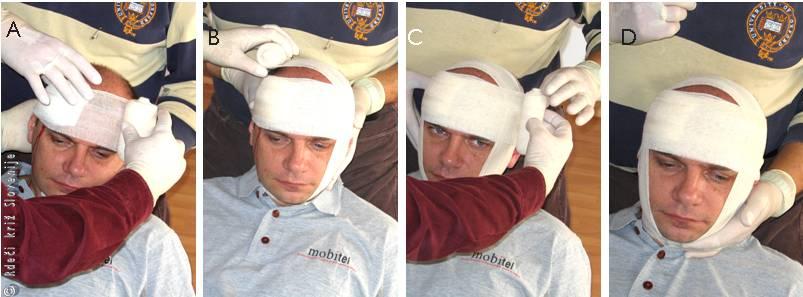 Poznamo številne bolj ali manj zapletene obveze glave. Opisali bomo enega enostavnejših načinov povijanja. Pričnemo s krožnimi zavoji preko čela in zatilja (Slika 13A). Obvezo stabiliziramo s tem, da v predelu ušesa zavoj zavihamo ter pričnemo s krožnimi zavoji, pravokotnimi na osnovno obvezo, preko temena in brade (Slika 13B). Kasneje povoj ponovno zavihamo in končamo s krožnimi zavoji preko čela in zatilja (Slika 13C, D).