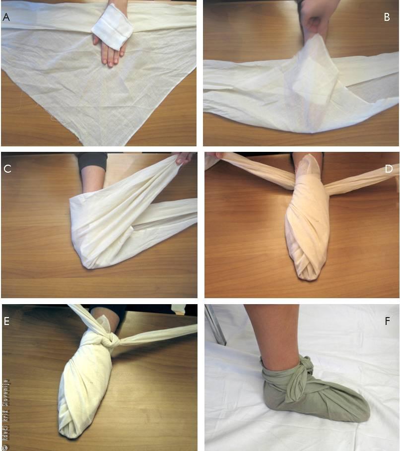 Roko položimo na razgrnjeno ruto tako, da prsti gledajo proti vrhu trikotnika (Slika 15A). Vrh rute zavihamo preko dlani (Slika 15B), nato preko dlani prekrižamo oba krajca – vsakega v drugo smer (Slika 15C) ter ju prekrižamo še za zapestjem (Slika 15D) in zavežemo (Slika 15E). Postopek je enak pri obvezovanju stopala, le da krajca rute zavežemo okoli gležnja (Slika 15F).