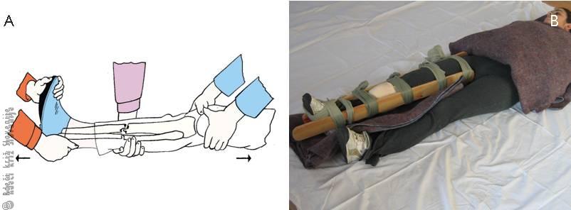 A – Dvigovanje in nameščanje poškodovanega uda (zlom goleni). Potrebna sta vsaj dva reševalca.