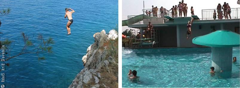 · Pri skokih posebej na glavo pazimo, da pred skokom pogledamo, kam bomo skočili (pri tem upoštevamo tudi plimo in oseko na morju ter valovanje) in ali ni slučajno na mestu, kjer skačemo, kakšen plavalec. Zelo pomembno je, da je pri skoku glava varno zaščitena med rokama in da skačemo iztegnjeni.