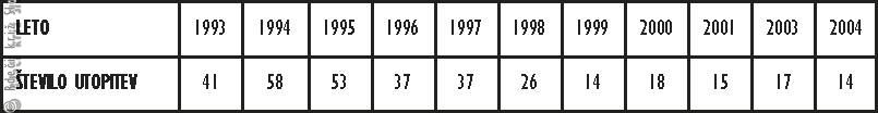 Podatki o številu utopljenih od leta 1993 do 2004.